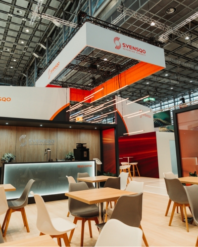 A highlight of the Syensqo stand was its adaptable, double-purpose space. One of the key requirements was the ability to host panels, presentations, and talks for visitors and the world’s media, without permanently dedicating space and losing valuable product showcase and hospitality areas. So, our solution was to dedicate an adaptable space that, when not in use for formal events, functioned as informal meeting areas and played looping brand videos. When needed, it seamlessly transformed into a stage for TED-style talks, on-stage presentations, and media sessions